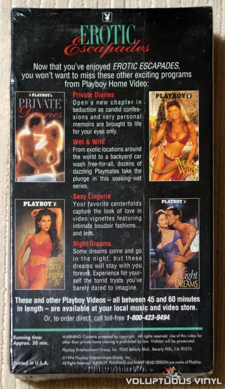 Playboy: Erotic Escapades is a special promotional video that was never released for sale or rental.  Features videos from previously released features of some of Playboy Playmates' hottest vignettes that all feature the theme of erotic escapades.